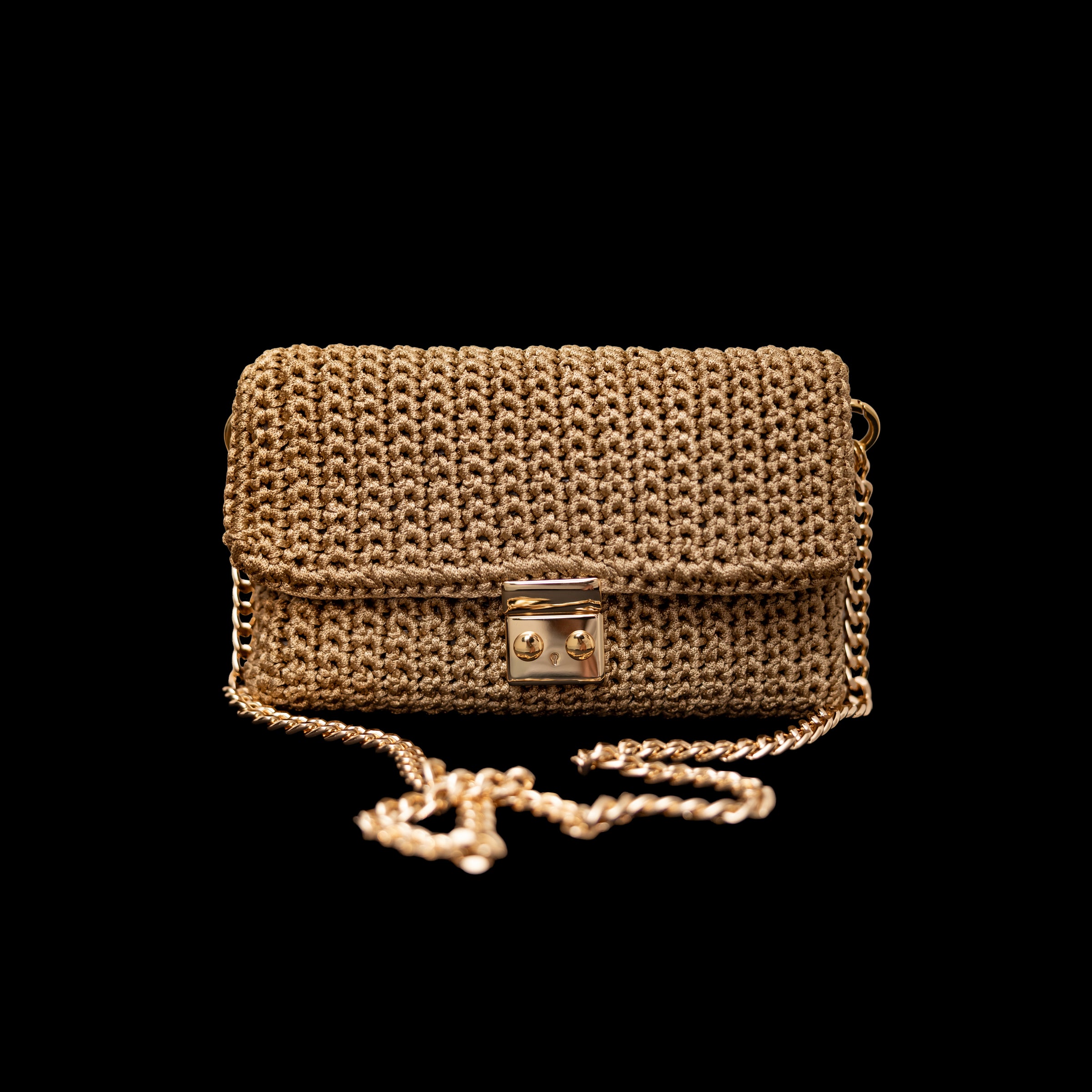 Bolsa em Crochet, alça em corrente abs dourada, ajustável, medida 1m. Medida 20cmx27cm. Peso 700gr. O peso pode variar até 100gr. Acompanha caixa para presente. Pode haver variação de tamanho até 3cm. Não possui forro.
