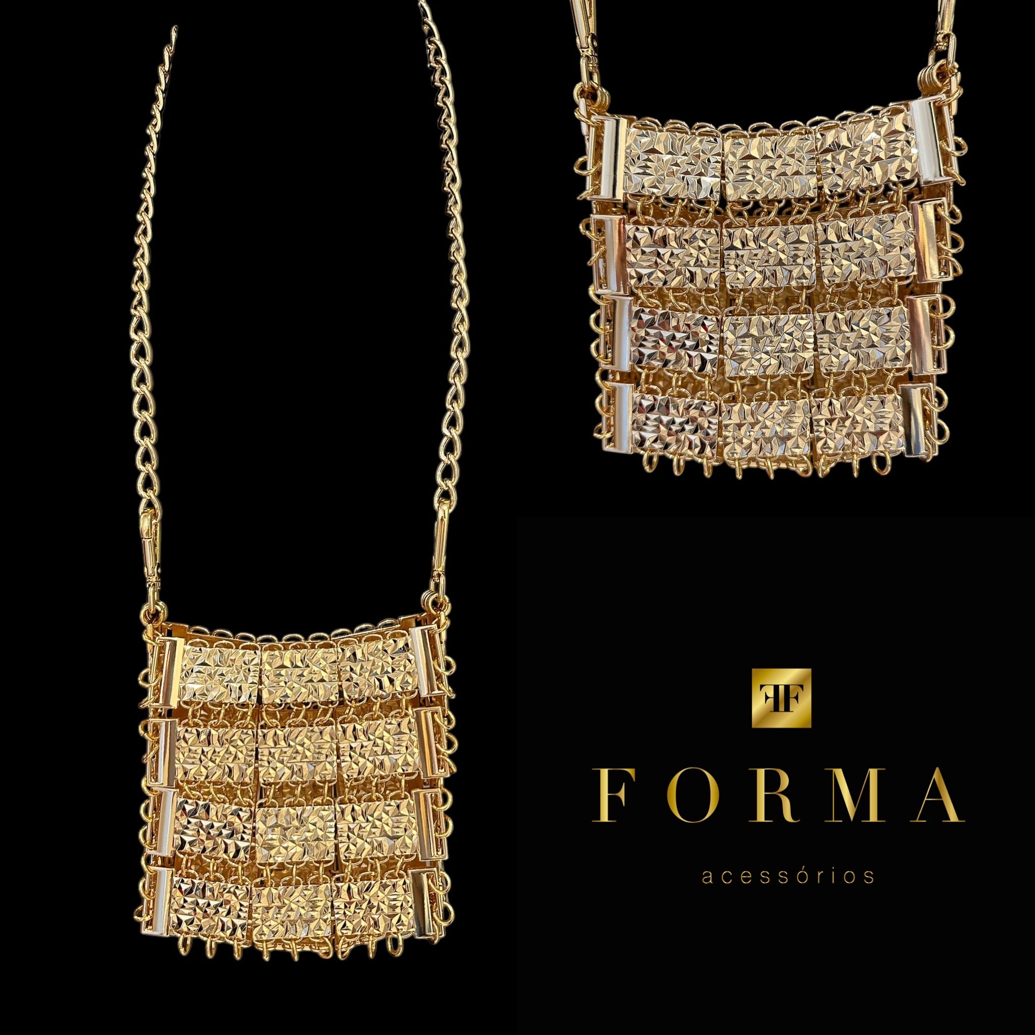 Bolsa em metal dourado, possui alça longa em corrente medindo 1m, ajustável. Peso 700 gramas.
