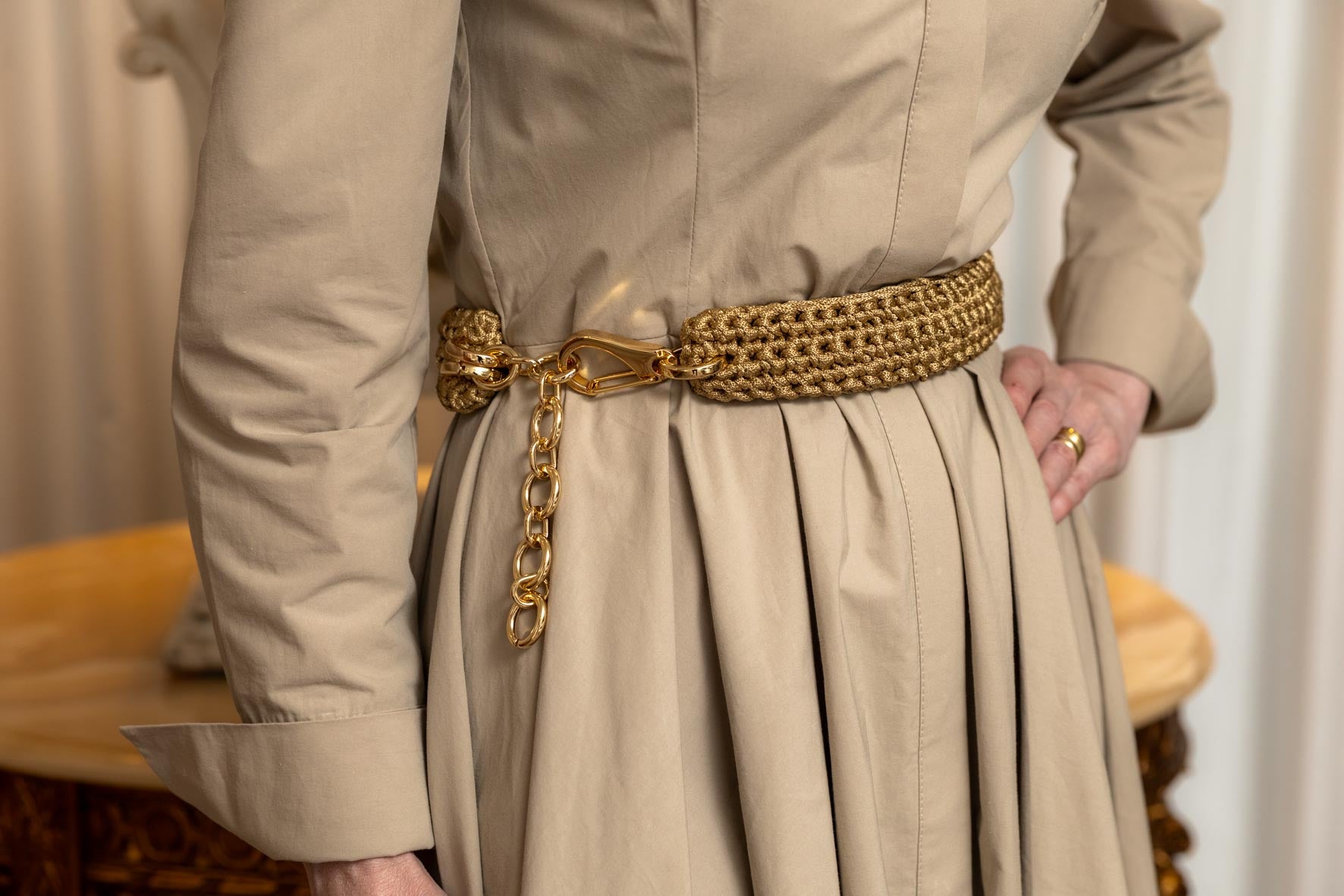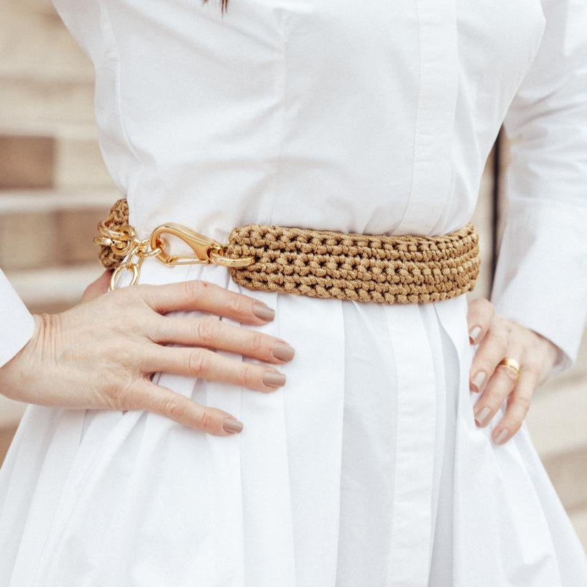 Cinto em Crochet e metal premium. Fechamento em mosquete ajustável.