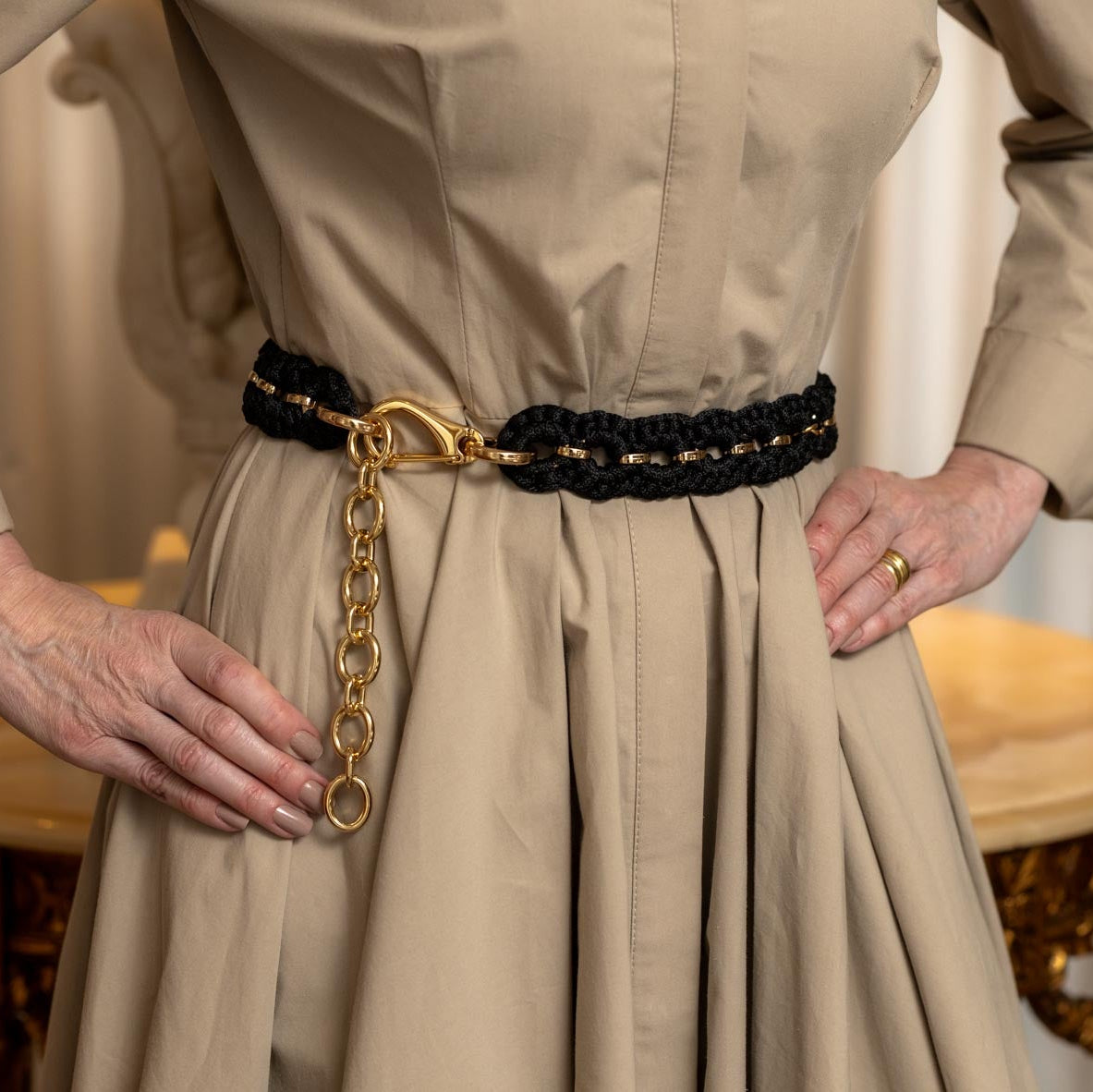 Cinto em Crochet e metal premium. Fechamento em mosquete medida 90cm, ajustável.