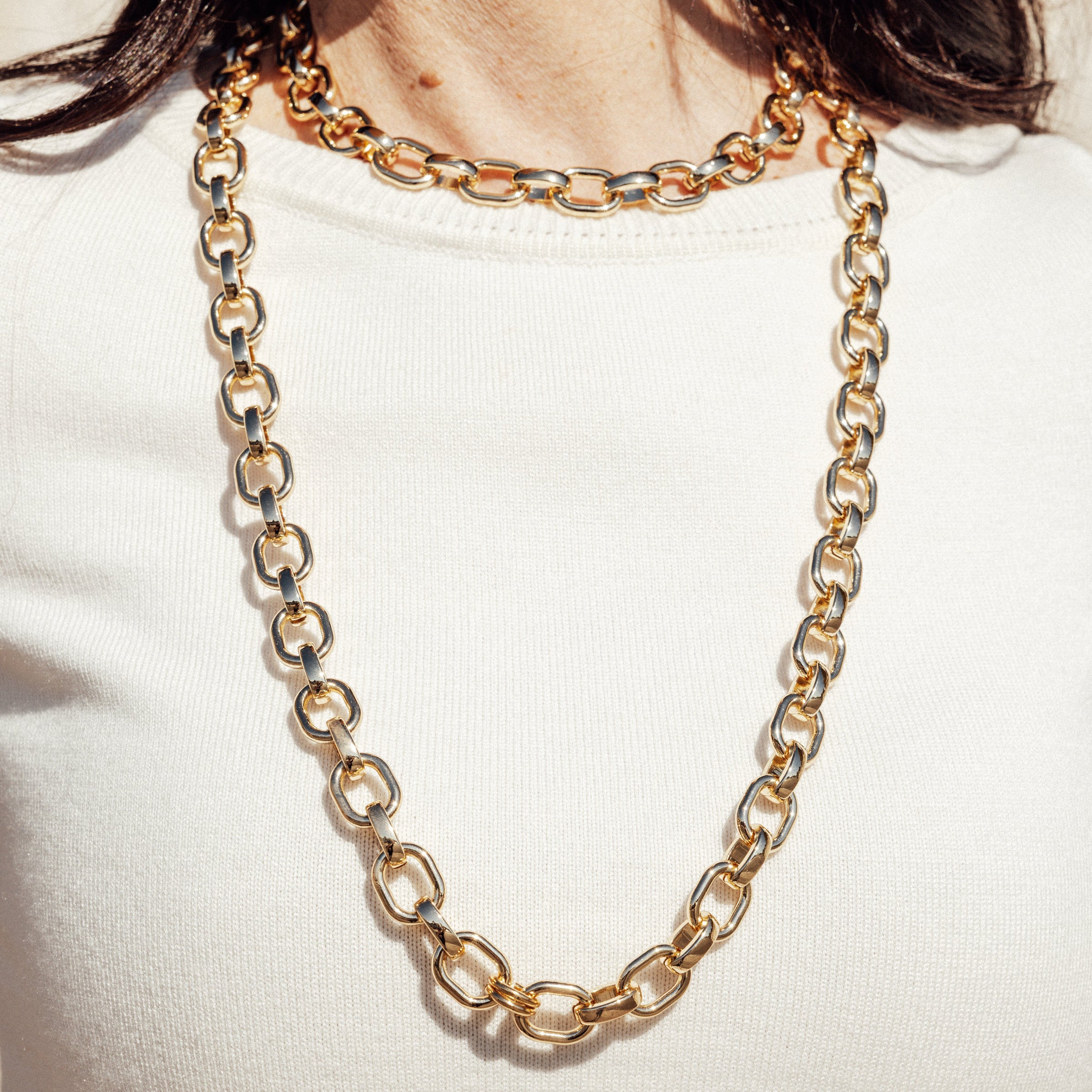 Colar elos dourados 14mm. Possui fechamento em mosquete. Medida 43cm. Na foto a modelo usa dois colares juntos, um curto outro longo.