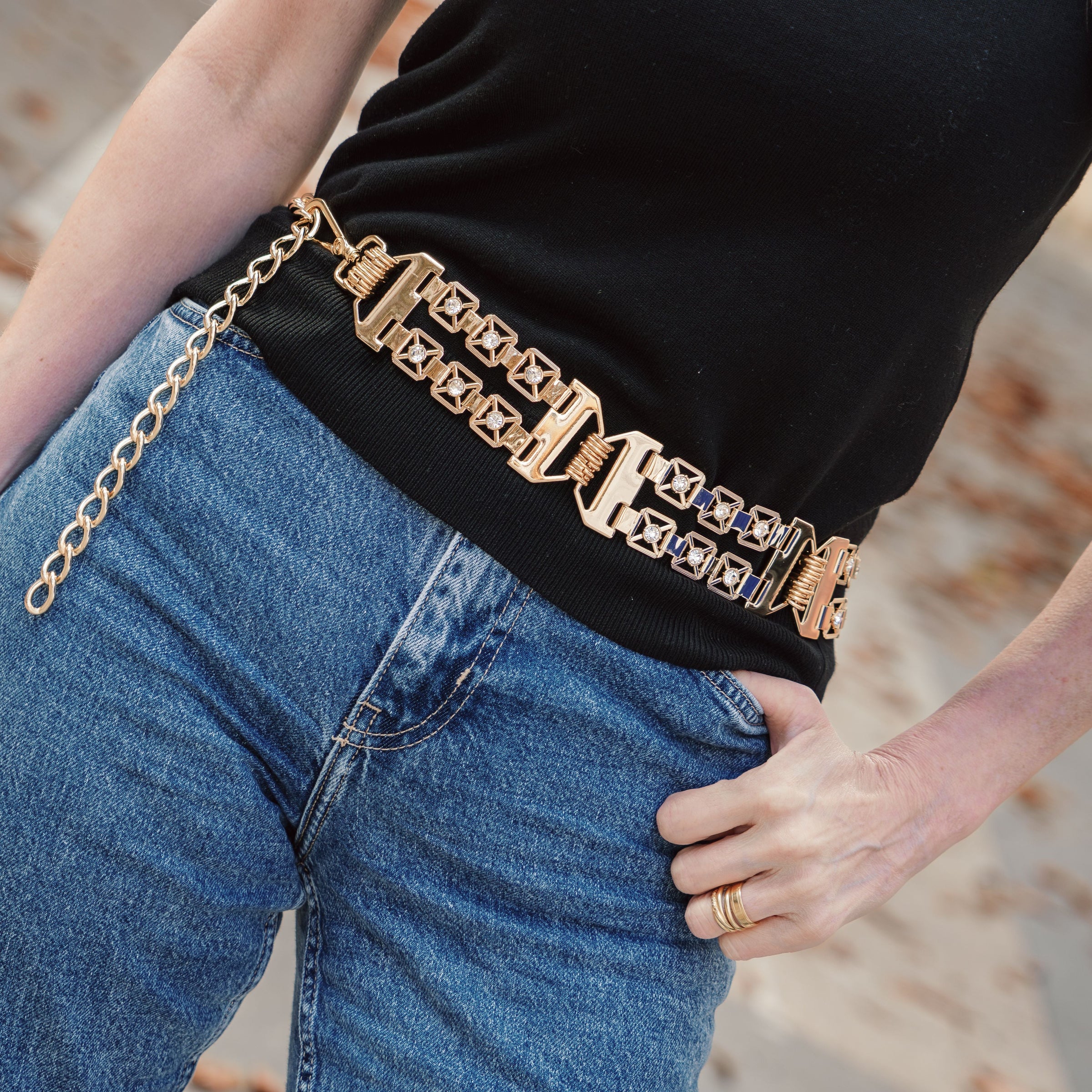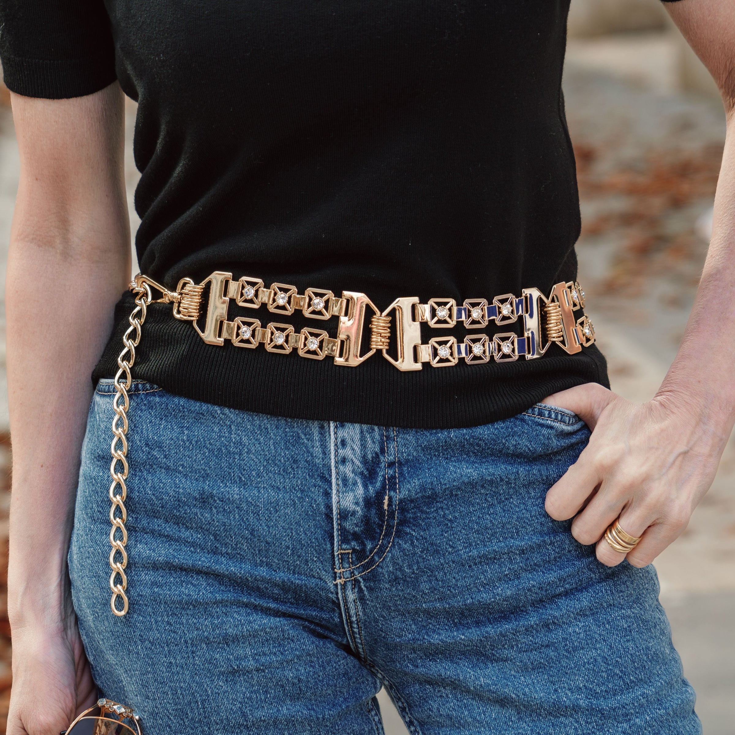 Cinto em metal premium e strass. Medida 1m. Ajustável.